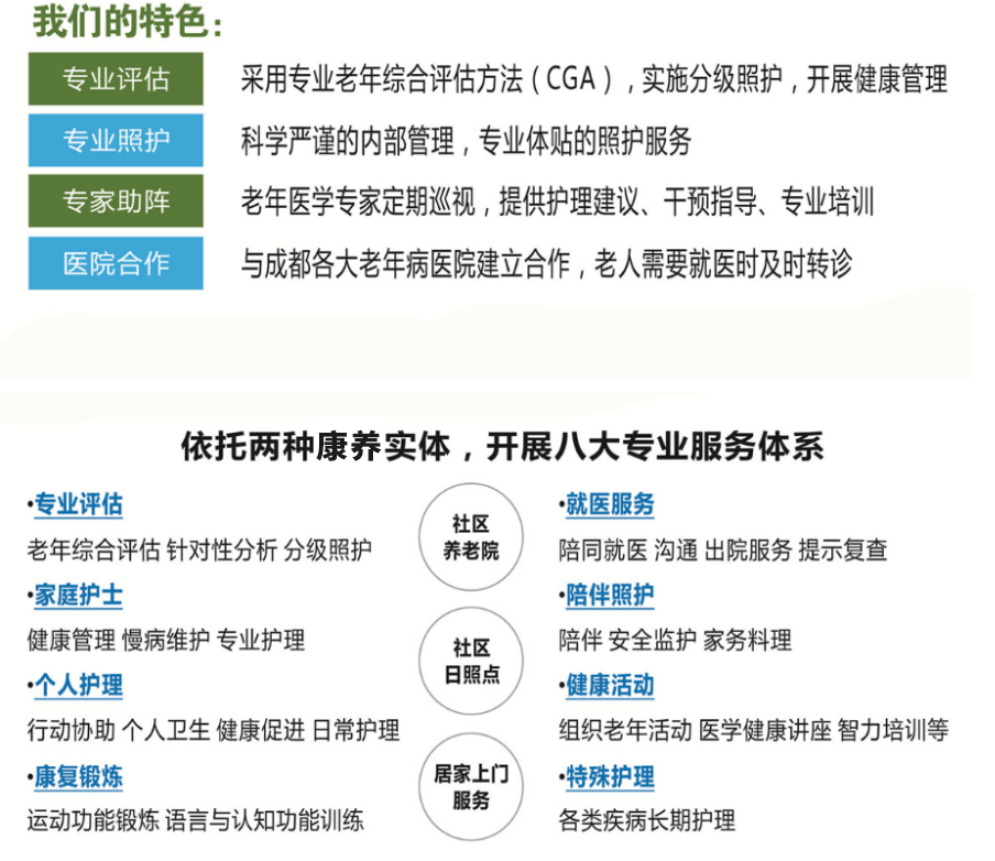 成都怡倍康養(yǎng)老服務有限公司是一家按照“康養(yǎng)結合”模式運營的專業(yè)化養(yǎng)老機構。我們與四川大學華西醫(yī)院老年醫(yī)學中心合作,專注于社區養(yǎng)老,并在實踐中堅持關注老年人身心健康。